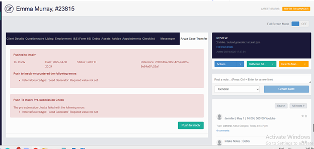 Open Aryza case transfer tab and hit Push to Insolv the button.
